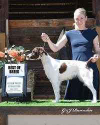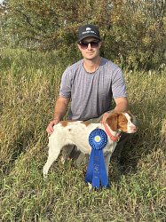 ![]() Owned by Brittany Lloyd | Whelped: May 23, 2025 Rip is sired by FC/AFC Kid's Royal Casey out of Ch. Kinwashkly Charming Wee Ms. D Rip went to three shows in North Carolina as a Baby Puppy. He won all three against competition and looks forward to going into regular classes as soon as he is old enough. He had another outing in November as a baby puppy, placing 3rd in the Baby Puppy Group. He will also compete in field trials! At Rip's first trial, at 7 months old, he placed 4th in the Open puppy stake, at the Tarheel Brittany club trial. He also placed 4th in the Open Puppy at the Southeastern Brittany Club trial. Rip placed 2nd in the Open Puppy stake at the Old Dominion Vizsla club in February. At the German Shorthair Pointer Club of Central Virginia, Rip was 3rd in the Open Puppy and also 3rd in the Open Derby. Not bad for a 9 month old puppy! At the Wilderness Pointer club trial, Rip was 2nd in the Open Derby. He also placed 4th in the Open Puppy at the same trial. Rip did a great job in the Open puppy at the Northern Virginia Brittany club to win his puppy points. |