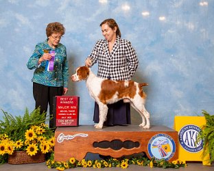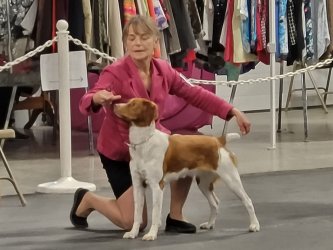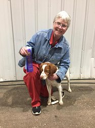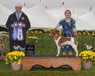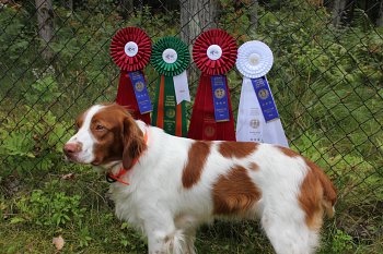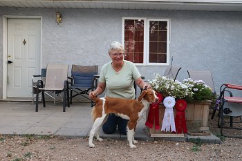 ![]() Owned by Julie Ross | Whelped: December 7, 2021 Fergus is sired by DC/GCh. Sovereign's Chasing Legends out of Ch. Kinwashkly Buffalo Gal Fergus attended his first weekend of dog shows at 6 months of age at the Prairie Canine Academy. He was Best of Winners at four of the six shows, each time for one point. He went home with 4 points to his championship. This young dog has great show ring attitude and has fun doing whatever is in front of him.Fergus came on strong at the Medicine Hat shows, taking Best of Winners three out of four shows to finish his championship at 7 months of age. He also won the Best puppy in Sporting Group three times. He will be something to watch when he matures! Fergus will continue to be shown but he may be field testing,or trialing in the future too. Fergus entered his first Rally Novice competition in November. He earned three legs needed to get the Rally Novice title. He added a fourth leg after earning the title as 1st place in his class. That was his second title at the age of 11 months old. Fergus went to the Assinaboin Kennel Club shows in Winnipeg April 2023. He was shown as a special for the first time and got Best of Breed at all 4 shows. This gives him his first points towards a Grand Championship. Judges were John Rownton, Barbara Heal, Stephen Dainard, and Shawn Nichols. Fergus went to his first field tests in May 2023 at the German Shorthair Pointer Field Club of Alberta and came home with two legs to his Field Dog Junior title. He loved the running and finding birds and will be back in the future. Fergus went to the Prairie Canine Academy shows in Balgonie, Sask. for their June shows. Due to a problem with his owner's motorhome he missed the first two shows. Once he did get there, he took best of breed at all four shows he made it for. At the fifth show he also placed 4th in the Sporting group under judge Kim Hamel. He added some more points towards his Grand championship title. He earned his first leg towards his Pre-Companion Dog degree at the Portage La Prairie shows. His next show will be the Canadian national specialty. Fergus added a bonus leg to his Rally Novice title already earned at the Alberta Kennel Club. He was select dog under judge Dana Cline for a 3 point major to his Grand Championship on Monday at the same show. At the Montana Brittany Club, Fergus placed 2nd in the Open walking Derby, with a very good strong race and a stylish point. Fergus earned the last leg needed for his Field Dog Junior at a test at the end of September with a strong race and stylish points. Fergus was Best of Breed two out of three days at the Red Deer dog show and made the cut in the group on the last day under Robert Dawson. Fergus attended the Wheat City Kennel Club shows in Brandon, Manitoba in November of 2023. He went Best of Breed at 3 out of the 4 shows. He also had Best of Breed at the Limited All Breed Sporting dog show on Sunday. Fergus finished his Grand Championship at the Calgary shows the end of November. He got Best of Breed and pulled in the group the first day. At the Crocus Kennel Club in February 2024, he placed 4th in the group under Patricia Taylor. He also earned two more legs on his pre-companion dog to finish that title. He also earned a Canine Good Neighbor title. He was a busy boy that weekend. At the Assiniboine Kennel Club in Winnipeg, Fergus was Best of Breed at two out of the three shows entered. As of March 31, Fergus is the number one Brittany for 2024. Fergus was Best of Breed under judge Steve Dainard at the Friday show of the Red Deer and District Kennel Club. The next two days he was Best of Opposite Sex at the same shows. He had the handicap of travelling to the shows with a bitch in heat and was not at his best in the ring. At the Calgary Kennel and Obedience Club spring shows in May of 2024, Brittanys had a high entry. Fergus showed in all four shows. He got two Best Opposite Sex awards, and two select awards. This gave him more points to his Bronze level Grand Championship. At the Alberta Kennel Club shows in August, Fergus was Best of Breed at three out of four shows. Pending CKC confirmation, this should complete his Bronze level Grand championship. Fergus loves the show ring! At the Manitoba Kennel Club shows, he was Best of Breed both days he was entered, and made the cut in the group one day. He was also Best of Breed at the Manitoba Sporting Dog club show. At the Medicine Hat Kennel Club in mid October with a large entry of Brittanys, Fergus started out with a select win in the Limited Group 1 show. In the regular show, he took Best of Breed under judge Wendy Paquette and went on to get 2nd in the Sporting Group. The next day he was Best of Breed and group 4th under judge Darla Hecke. The third day he again got select dog. Fergus went to his hometown shows, the Wheat City Kennel Club shows, in Brandon, Manitoba the second weekend in November. He took Best of Breed at three of the four regular shows. Judges were Kim Hamel, Colm Beattie and Rita Beattie. At the Crocus Kennel and Obedience Club, Fergus won Best of Breed under judge Dann Wilson on Sunday. At the Red Deer and District kennel Club shows, Fergus was best of breed in a large entry the first and third show under judges A. Gaudin and H. Glenndenning. The second show, he earned select dog status. At the Calgary Kennel and Obedience Club shows in Olds, Alberta, Fergus won Best of Breed under Mel Saranchuk in a good entry, May 2025. At the Fort Garry Kennel Club shows in May, he went Best of Breed and placed 4th in the group. He repeated the breed win at the second show, and placed 3rd in the group. He was not entered for the 3rd and the 4th show, but got the breed again at the last show. In June, Fergus tried a new sport, Sprinters, which involves chasing a lure at top speed. He earned two legs in his first two tries. Entered only one day at Portage Kennel Club, he took the breed and placed 4th in the group under Murray Euson. In July, Fergus entered 