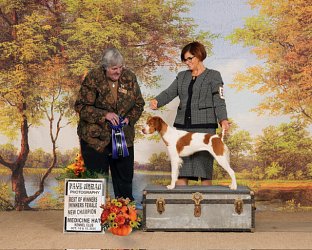 ![]() Owned by Leslie Andreas | Whelped: August 31,2024 Wendy is sired by DC Wingra's Indy Go! out of Ch. Kinwashkly By A Mudslide Our little liver natural bobtail, Wendy, made her show ring debut at the Assinboine Kennel Club in Manitoba. Wendy, 7 months old, was Winner's bitch, best of Winner's and best of breed under judge Corinne Walker on Saturday. On Sunday, she repeated the win under judge Pamela Bruce. At the Wascana Dog Club July shows, 10 month old Wendy was best of Winners under judge Kim Hamel at show one. She was Best of Winners and Best Opposite Sex over a specials bitch at the second show under Corinne Walker. At the third show, a designated booster show for Brittanys, Wendy was Best of Breed from the classes over three group winning/placing specials to finish her championship. She went on to place 3rd in the sporting group and win Best Puppy in Group under judge Dr. Gail Forsythe, earning her additional points to bring her total for the day to the maximum allowed, 5. At the fourth show, Wendy was again Best of Winners. She moved up to specials on the last day to earn 2 Select bitch awards, beginning her points toward a grand championship. She will be going to a few field trials this fall and running in puppy and derby stakes. Wendy went out as a moved up special at the Alberta Kennel Club, and was Best Opposite sex and best puppy in breed under judge Katrina Santos. She was Best Puppy in Breed at the Westwinds Specialty the same weekend. At the National specialty, Wendy won Best in Sweepstakes under judge Judith Morrall Brown. |